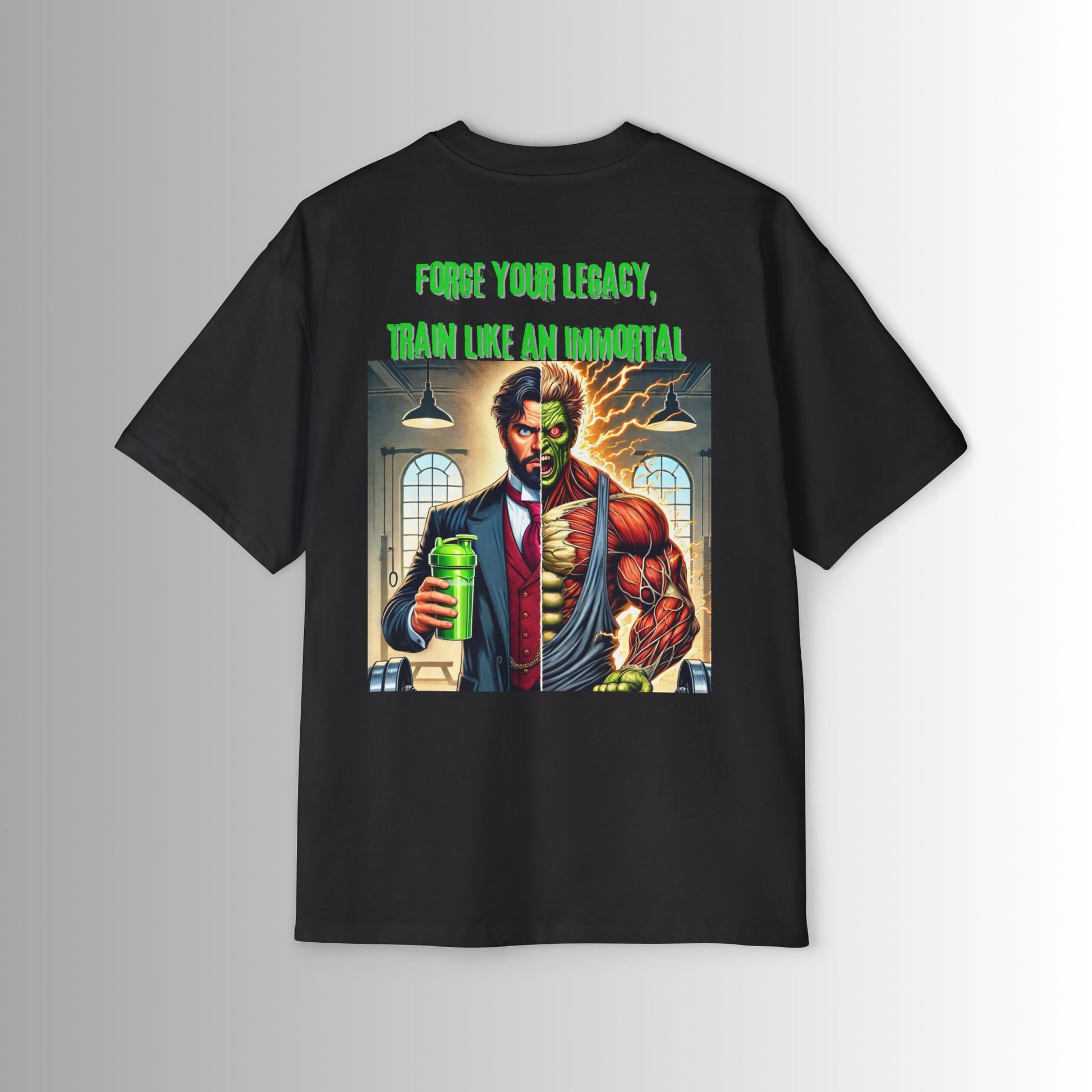 This collection captures the duality within us all—the professional by day, the beast in the gym by night—reminding us that legendary status isn’t just earned; it’s forged. With every set and sip, you transform, not just in body but in spirit, echoing the immortal words: train like an immortal, live like a legend. The graphic, a striking split between refinement and raw power, symbolizes the balance necessary to achieve greatness. Wear it as a reminder that through dedication and the right mindset, you have the power to carve your name into history—becoming legendary, one workout at a time.